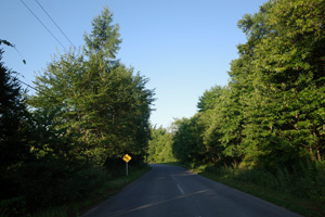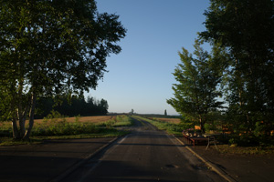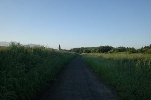 あまり心配せず、カンタンの声が響く畑の冷やっと涼しい空気の中へそのまま進んでゆく。朝陽はまだ森や丘に隠れている。畑の起伏も未だ青い影の中、真っ青な空は光で一杯だ。それにGPSトラックはすぐ舗装路に戻ってくれた。