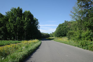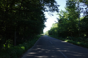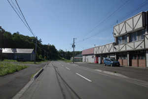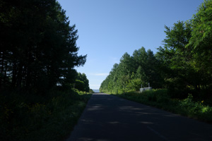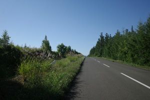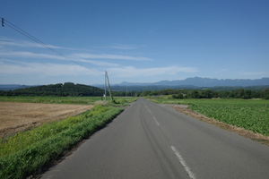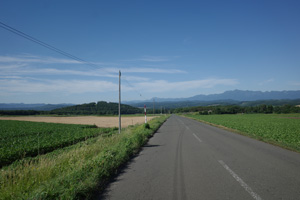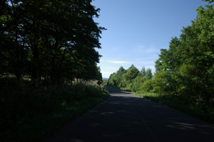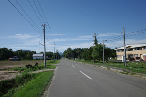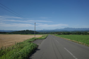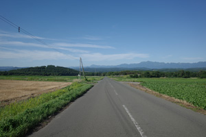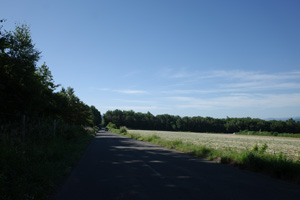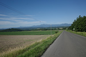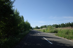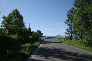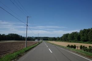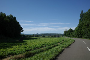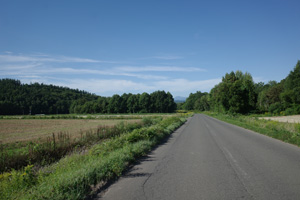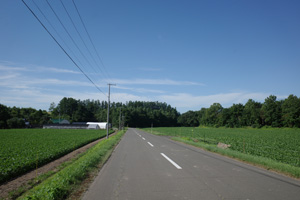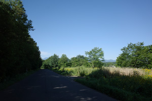突然辺りが開けて布礼別上手の畑の中へ放り出され、森の1本道は終了。その場所で道の向きが変わり、開けた畑を布礼別へ100m、一気に下ってゆく。