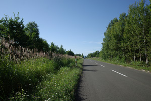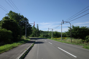 森の脇や畑に続く、里の道だ。暑さはベベルイ基線の日なたと変わらない。いや、少し下ってきたのと日が昇って、もう少し暑くなっているように思う。車の少ない静かな裏道だけあり、熊看板が出ていたりはする。