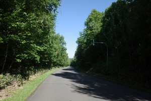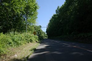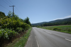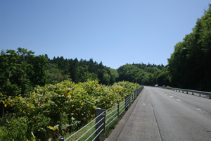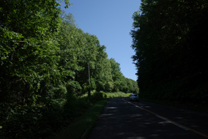 三の山峠の下りでは、道の向きが変わるのと、道を囲む木々が道から少し離れるせいか、多くが日なたの中。もう下りでも熱くてしょーがない。