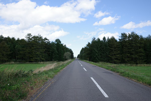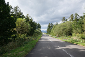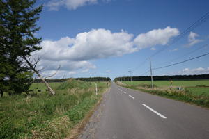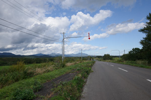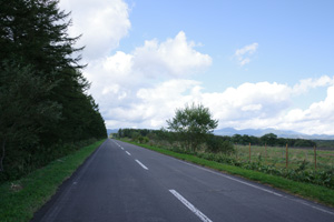 しかし上標津を過ぎると、先入観と違う風景が展開し始めた。景色の中の起伏が、単調になりがちな牧草地と防風林の風景にアクセントを付け、むしろ整った風景が際立っている。また、山裾が近づき始めてその距離が意識されることにより、風景の拡がりが却って適度な開放感を伴って感じられるようになってきた。今日の道は間違いなく当たりだ。
