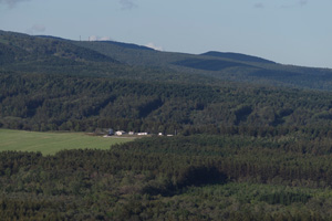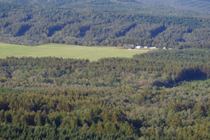 秋のこの時期、増して昨日の嵐の後。遠景が全体的に過去最大級にくっきりはっきりとよく見える。尾岱沼や野付半島、風蓮湖。国後島の岸壁っぽい岸はもちろん、奥の高い山がはっきりくっきり空に浮き上がっている。後で石川さんに質問したら、それは国後の爺爺岳で、1000m以上ある山らしい。方向を変えると、さっき通ってきた計根別の、建設中の乳製品工場が森の中に輝いている。