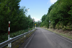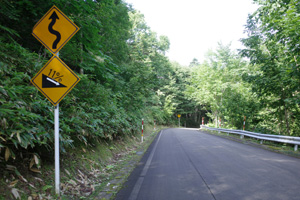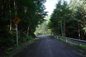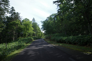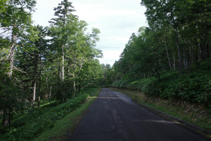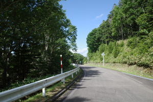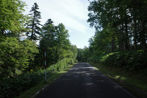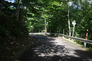 道道588に戻ってからは、しばらく山肌を巻いてゆく。さすがは標高600m台、苔生した幹に枯れかけた枝、森がちょっと浮世離れしたような厳しい表情だ。例年より緑が濃い、というより木の形が見慣れないボリュームに見えるのは、3年振りの訪問だからかもしれない。あまり速度を出しすぎないよう、気が逸って転倒などせぬよう、斜度の緩急と急カーブが続く下りを、気を付けて速度を抑えてゆく。
