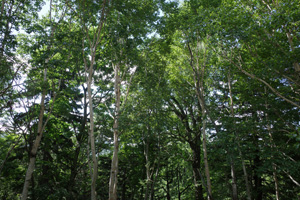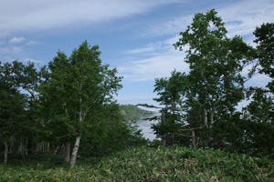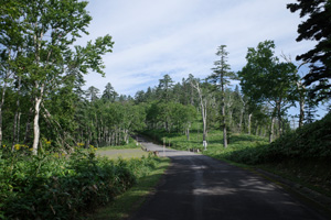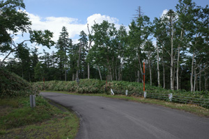 津別峠の津別側すぐ下手で道道588からふるさと林道津別峠線が分岐し、ここまでの屈斜路湖岸側斜面から津別側斜面に替わって登ってゆく。稜線からこちら側では辺りのガスは嘘みたいに消え失せている。雲は出ているものの天気はもはや晴れ。斜度が厳しいだけあり、木立の向こう、雄阿寒岳と拡がる樹海の眺めが刻一刻と変わってゆく。