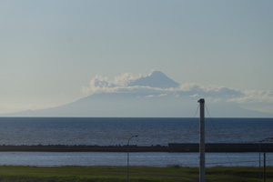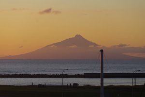 夕方の日本海上は青空から赤みがかった色に変わりつつある。利尻は中腹に少し雲が掛かっているだけ、むしろ利尻岳のギザギザした青いシルエットとたなびく雲がよく似合う。