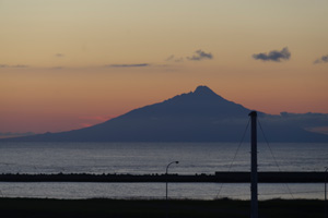 夕食を終えて部屋に戻っても、まだ日本海上はしばらく明かったが、次第にオレンジ色が濃く、利尻は青から紺に変わっていった。時々部屋の灯りを消して黄昏の空を眺めていたら、ここまで森と牧草地一色だった旅の気分が、一気に日本海の色に入れ替わった。