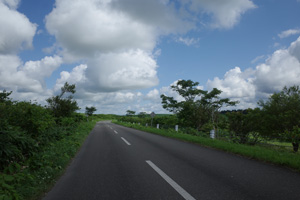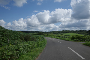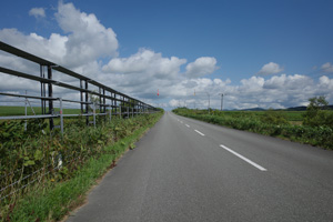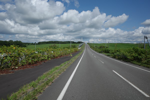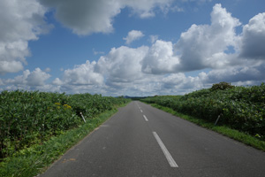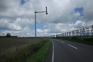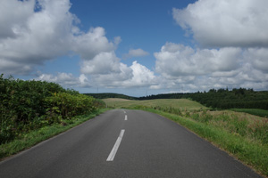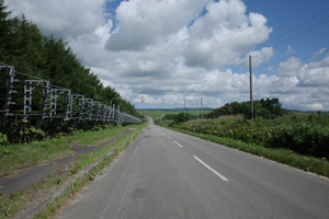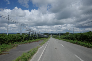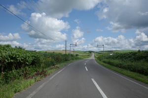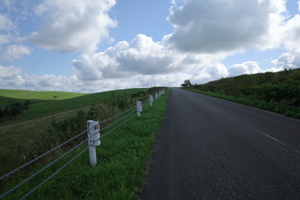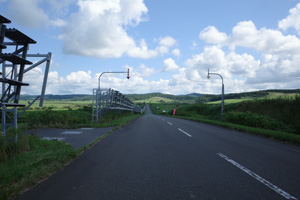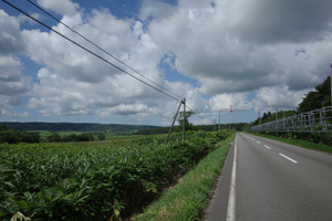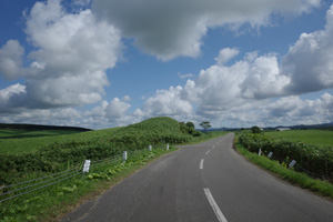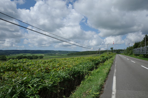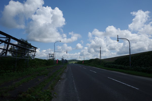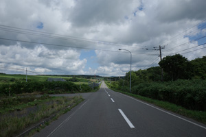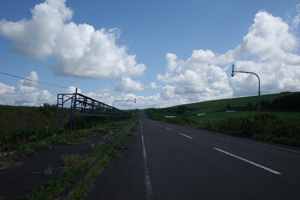 その先は、丘の登り下りが続く育成牧場のハイライトだ。木立が無いせいか、路上の気温はかなり上がっていて、たかが丘でも登りが続くと頭がぼうっとする。脚を停めて周りを眺めるには都合が良い。それに、サロベツ原野周辺の低地から丘陵部に来たせいか雲が増えていて、しばしば陽差しを隠してくれた。すると途端に頭がはっきりしてくるのだった。如何に陽差しが強いかということが改めてわかる。そういう曇りに生かさず殺さず位で、進行は助けられていた。